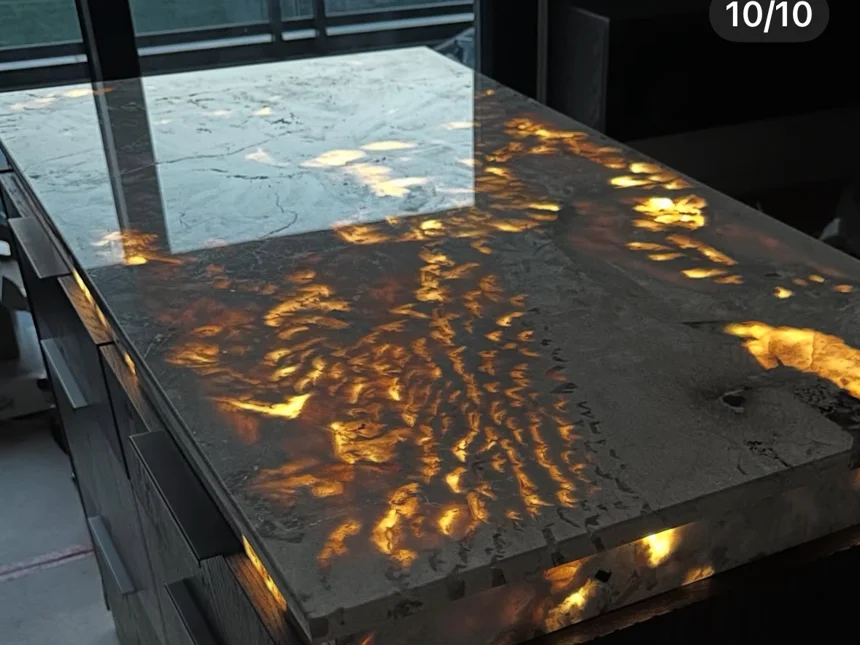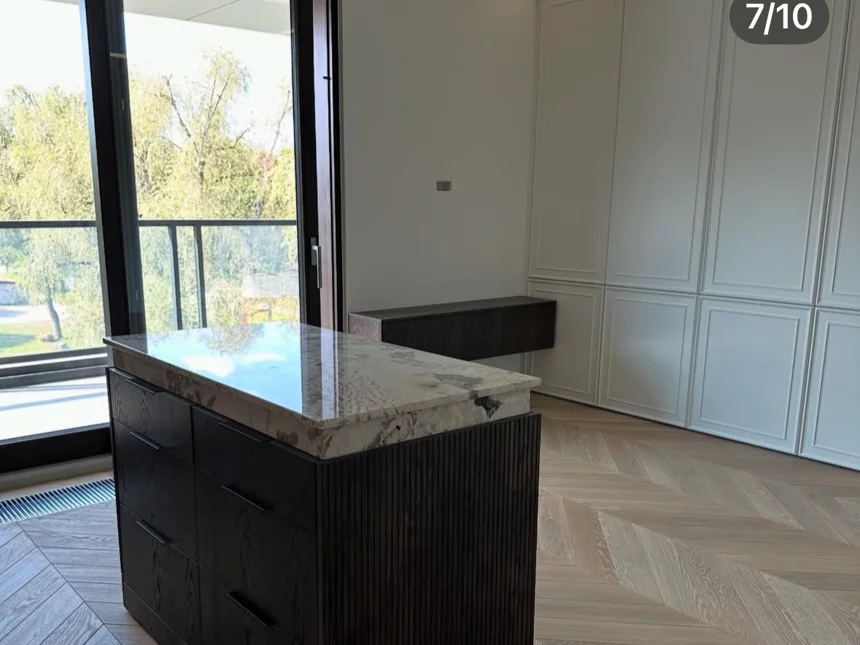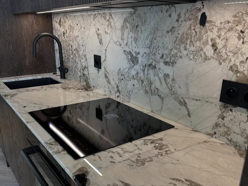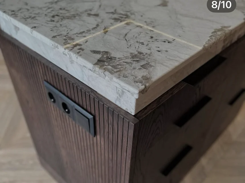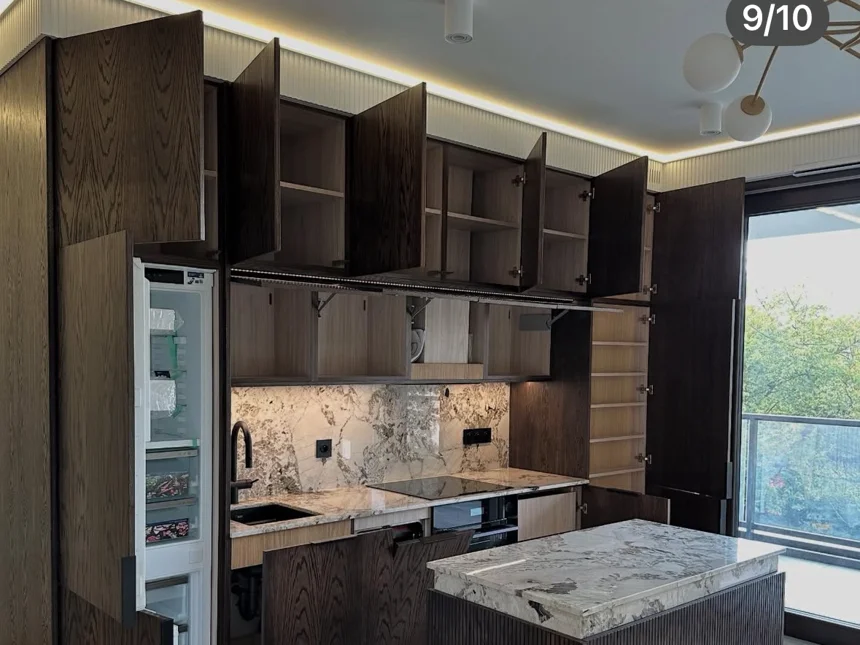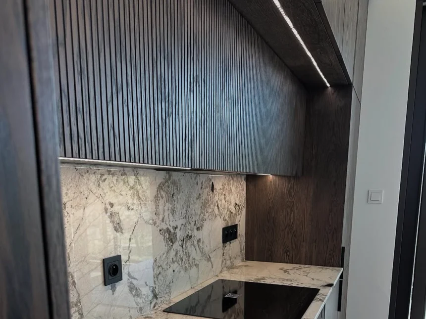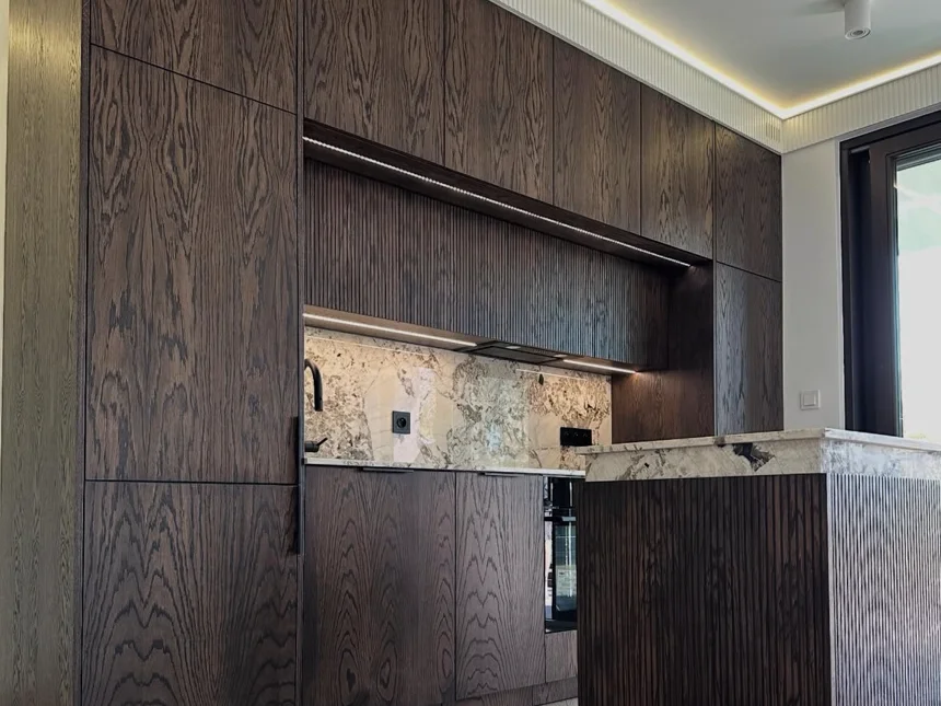 Kuchnia z dębowym fornirem i marmurowym blatem