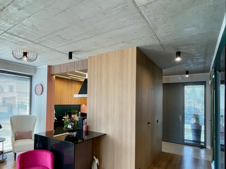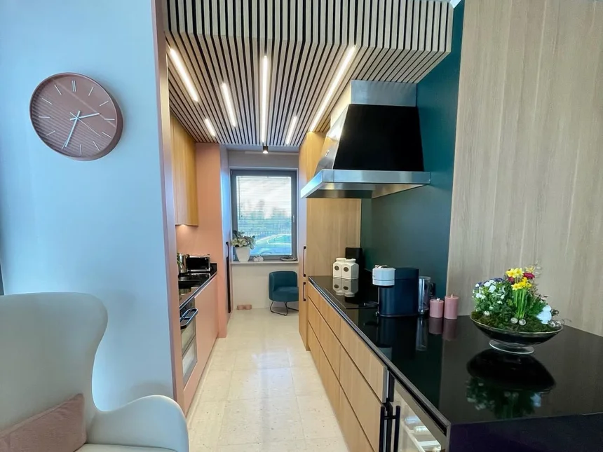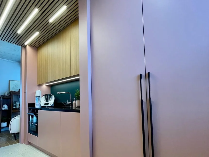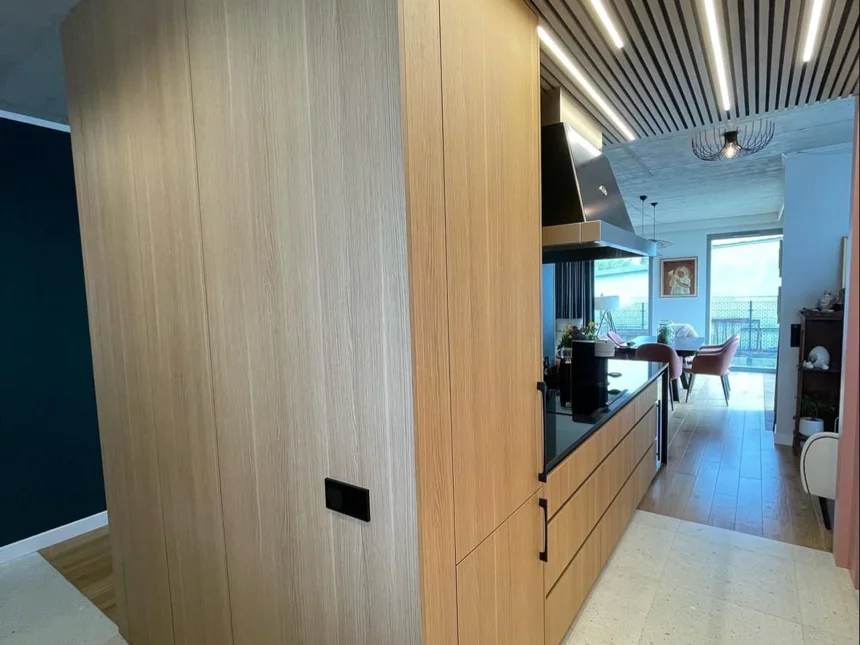 Nowoczesna kuchnia z ciemnym blatem kwarcowym, lakierowanymi frontami bezuchwytowymi i elementami forniru dębowego
