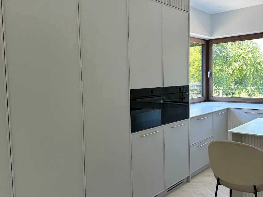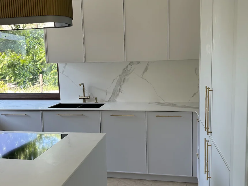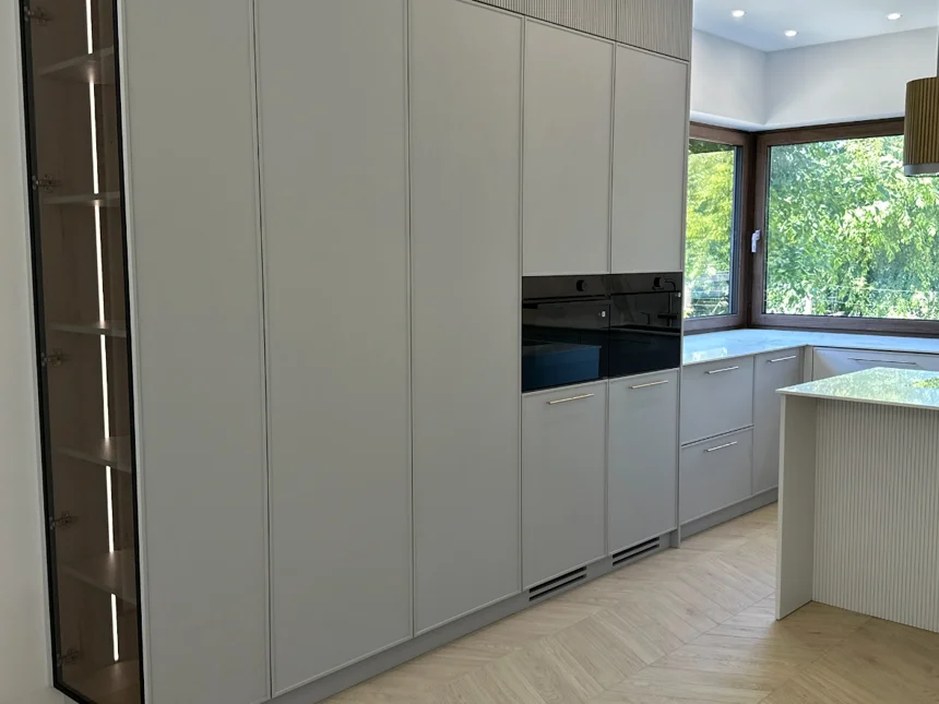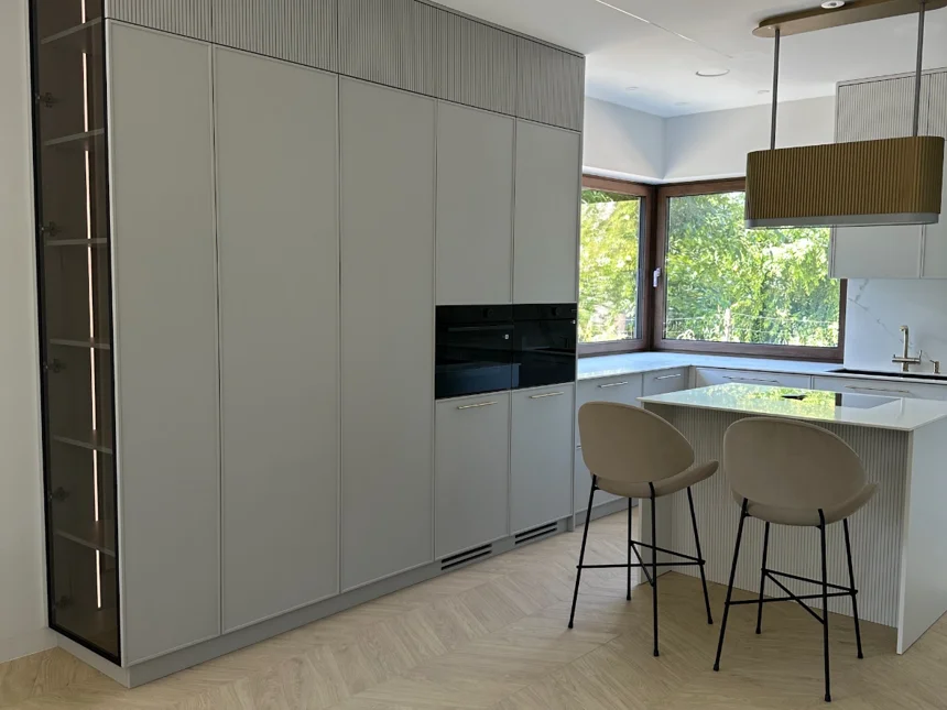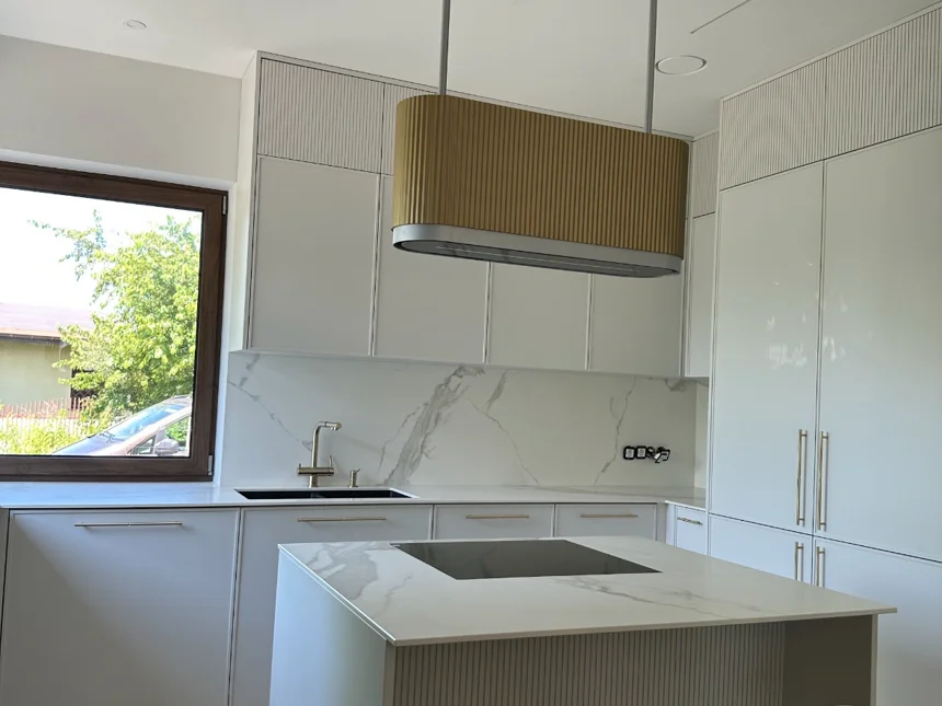Nowoczesna kuchnia z frezowanymi frontami, lamelami i jasnym blatem kwarcowym