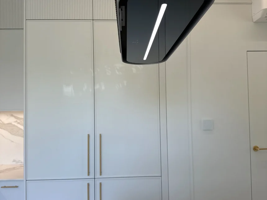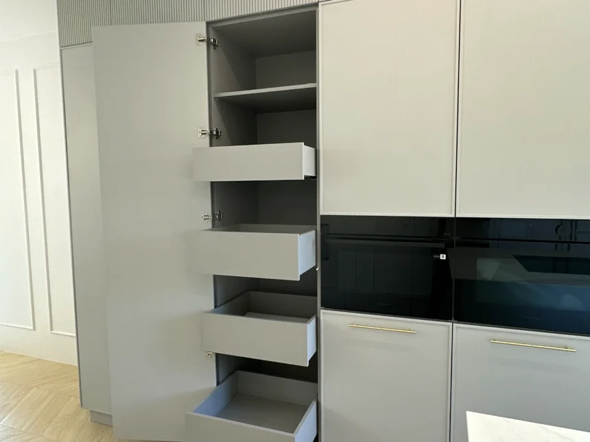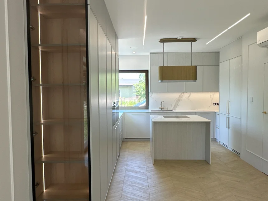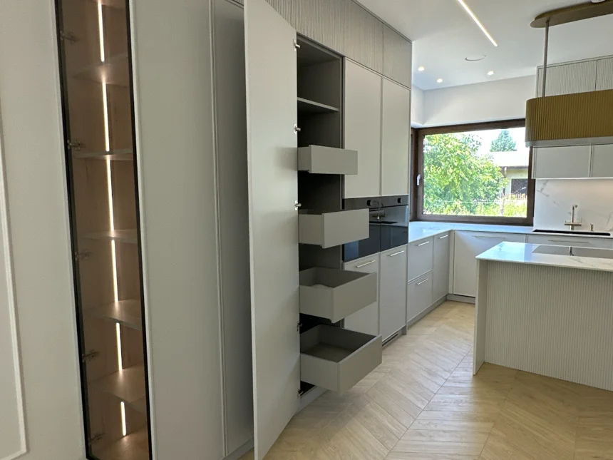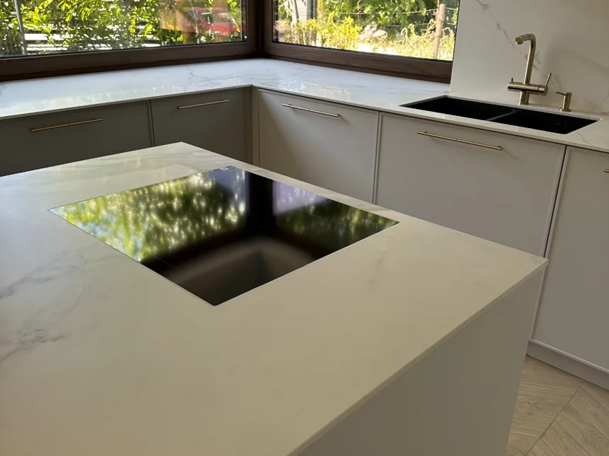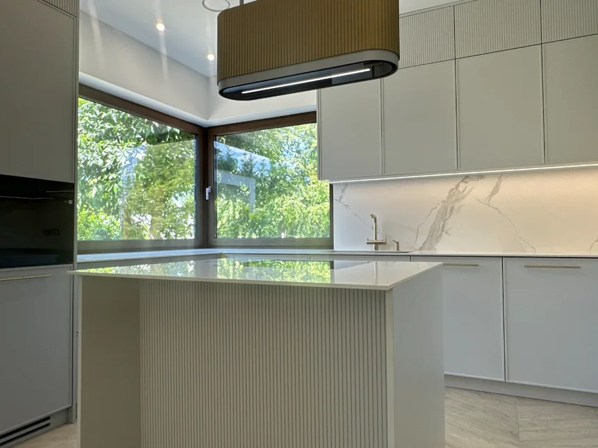 Nowoczesna kuchnia z frezowanymi frontami, lamelami i jasnym blatem kwarcowym