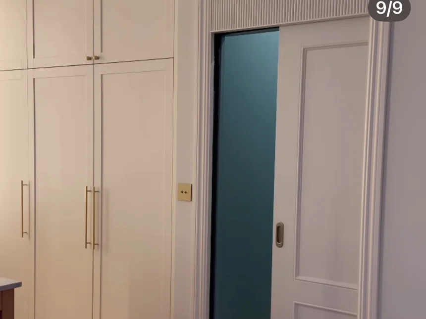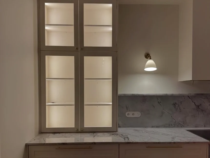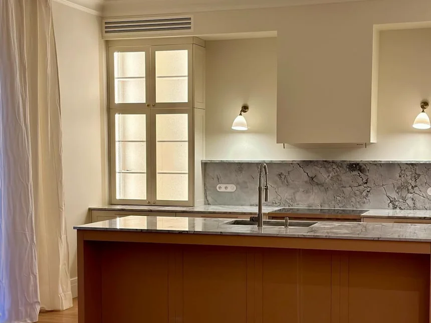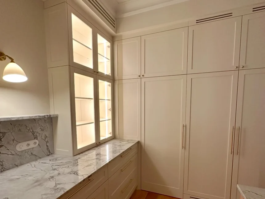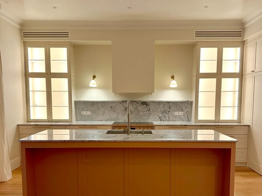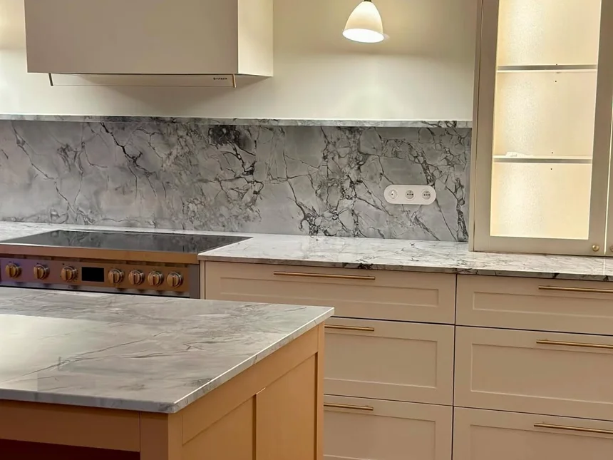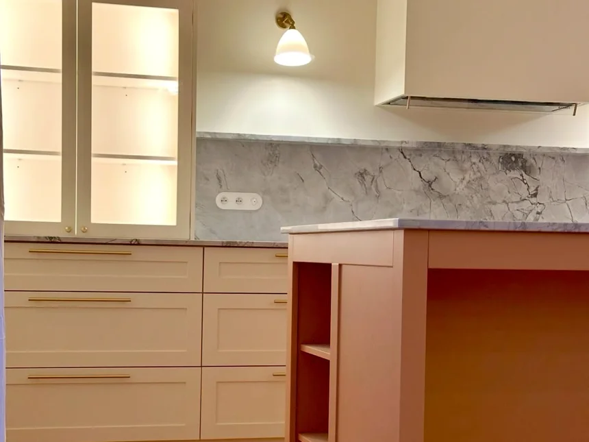 Skandynawska kuchnia z marmurowym blatem i białymi frontami ramkowymi